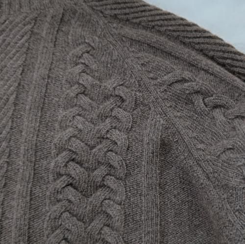ラグランスリーブで、袖および前と後ろの両面に変わりケーブルなどの地柄が入っています。